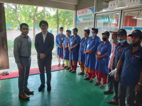 TOPICS 2023.09.09 JETROダッカ支局 安藤様が来社されました JETROダッカ支局 安藤様が当社バングラデシュ工場の見学にお越しくださいましたバングラデシュへ進出している日系企業を視察し、今後 進出する企業への紹介資料作成の題材としてヒヤリング訪問されました。